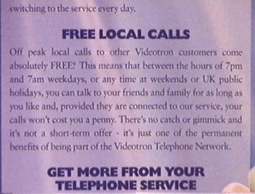 This argument is smashed by Videotron's own literature. As well as Tom Grady's testimonial, have a look at the front, back and middle of a typical Videotron flyer. It could hardly be more explicit in encouraging unmetered local calls to ISPs - in fact, in other marketing material they ask you, if you're not sure, to ring them up and they'll tell you which ISPs have Videotron lines.