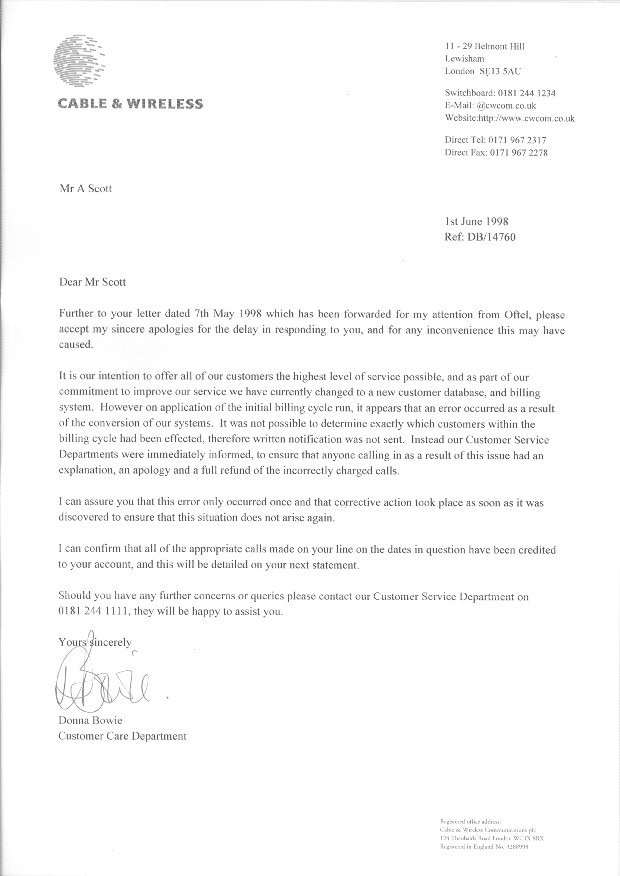 It is our intention to offer all of our customers the highest level of service possible, and as part of our commitment to improve our service we have currently changed to a new customer database, and billing system. However on application of the initial billing cycle run, it appears that an error occurred as a result of the conversion of our systems. It was not possible to determine exactly which customers within the billing cycle had been effected [sic], therefor written notification was not sent. Instead our Customer Service Departments were immediately informed, to ensure that anyone calling in as a result of this issue had an explanation, an apology and a full refund of the incorrectly charged calls.