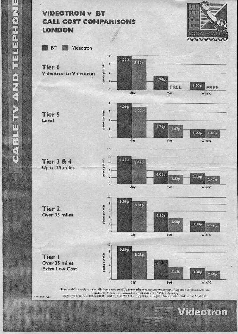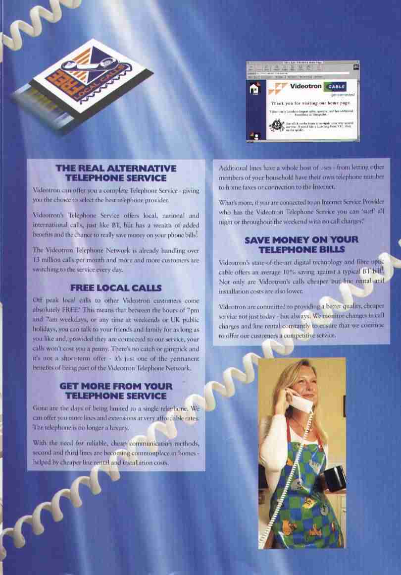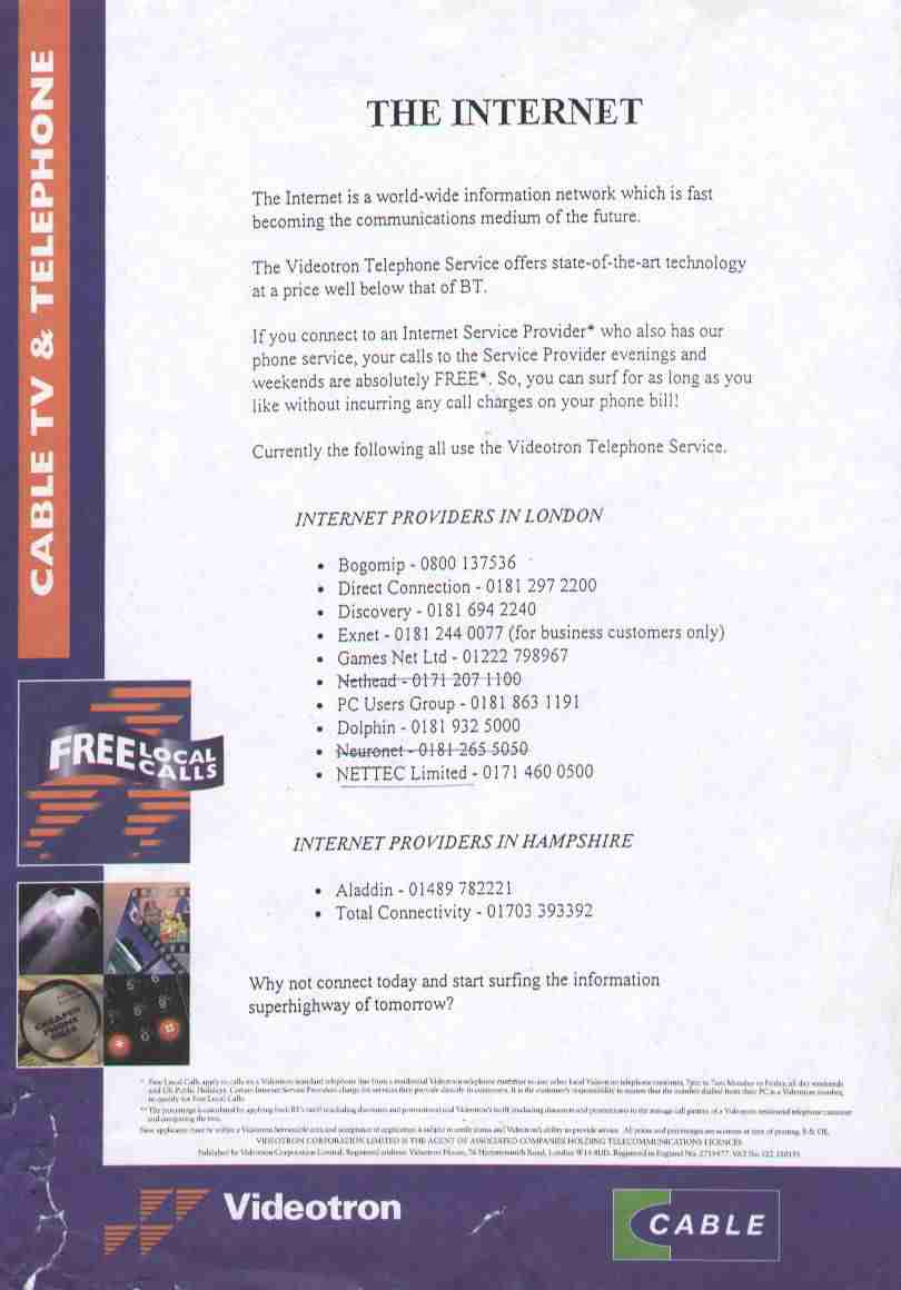 There are also scans, contributed by David Barton, of the five pages (1 2 3 4 5, each about 50KB) of The Internet, Videotron's brochure supplied to all customers from the end of 1995 until June 1997. Note the emphasis everywhere on 'free' calls.