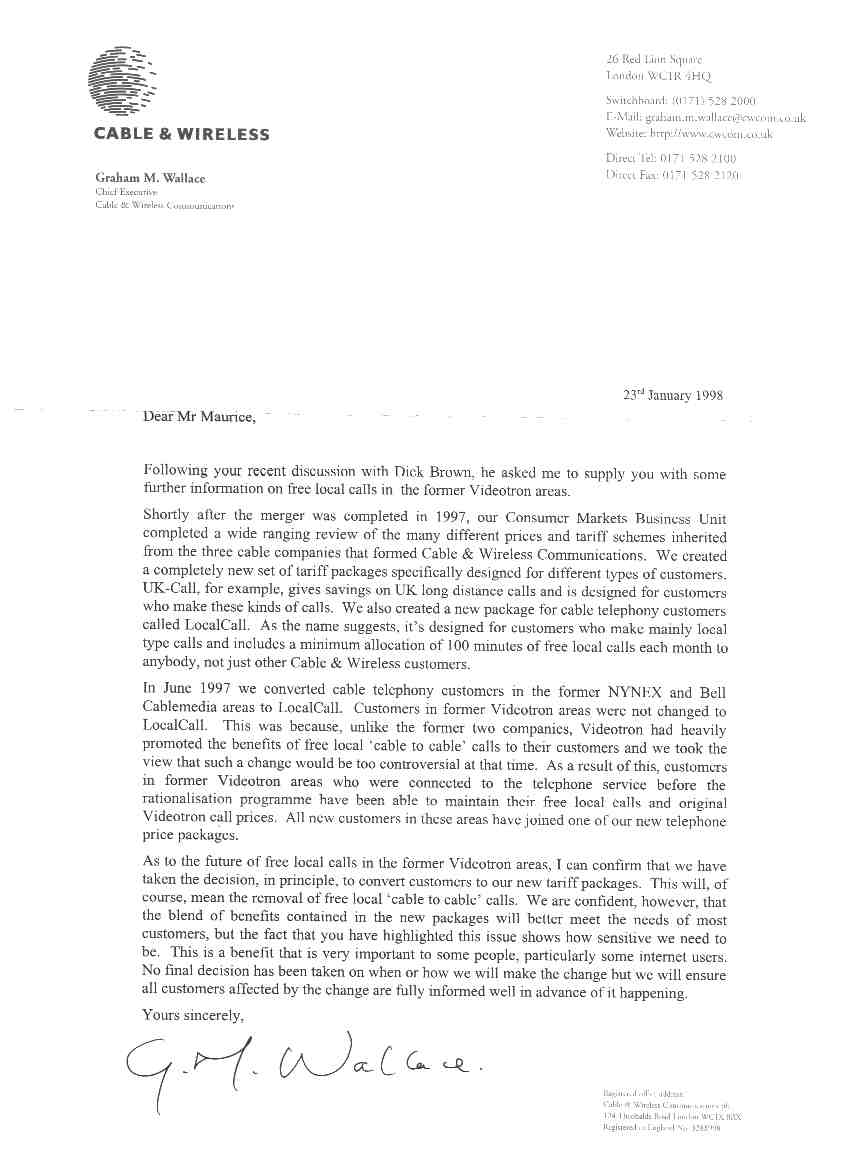 ... we have taken the decision, in principle, to convert customers to our new tariff packages. This will, of course, mean the removal of free 'cable to cable' calls ... No final decision has been taken on when or how we will make the change ...